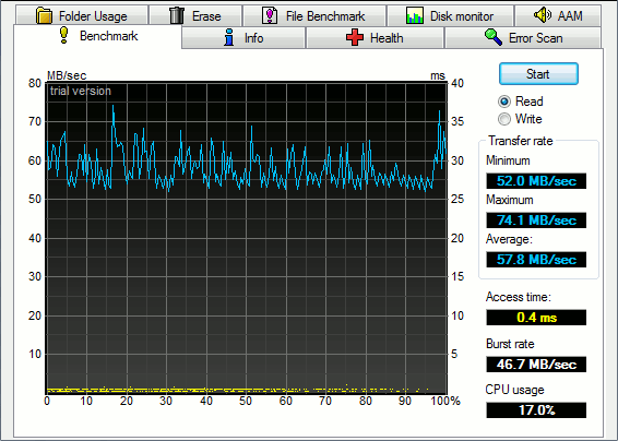 Az új SSD-meghajtó azonban nem csak a véletlenszerű elérésben aláz -- az átlagos elérési idő a tipikus 12 ms helyett csupán 0,2-0,4 (!) milliszekundum --, szekvenciális írásban és olvasásban is tönkreveri az egyedül kapacitásban brillírozó hagyományos merevlemezeket. Egy 1,8 hüvelykes noteszgép-merevlemeztől manapság maximum 20-25 megabájt/s-os írási és olvasási sebesség várható el, a Samsung SSD-je ezeket az értékeket könnyedén átugorja. Szintetikus tesztjeink szerint az olvasási és írási sebesség közelíti a gyári specifikációt, szekvenciális olvasás esetén a 90 megabájt/s-os, az írás a 60-70 megabájt/s-os értéket, de a valós körülményeket szimuláló másolási tesztekben sem mértünk sokkal rosszabbat.