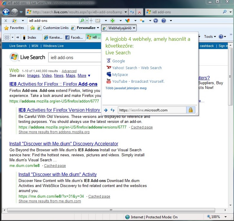 Az Accelerators ezzel szemben nem akkora újdonság, hiszen a címsor mellett megjelenő bővíthető kereső már hétköznapinak nevezhető. Ide az alapbeállításokon kívül befűzhetünk további keresőket, térképszolgáltatót, szótárat stb. A pluszt az adja, hogy bármely szót a weboldalakon kijelölve egy kis kék nyíl tűnik fel (a Microsoft Office 2007-ben megismert gyorsformázás menühöz hasonlóan), melyből azonnal elérhetőek a beállított keresők, így pedig érthető a funkció elnevezése is. A normál szöveges keresők esetén nem ajánl fel előzetes találatokat, ahogyan például a Firefox alá készített Ubiquity kiegészítő teszi, de kiválasztva a megfelelő forrást, új fülön jeleníti meg az eredményeket.
